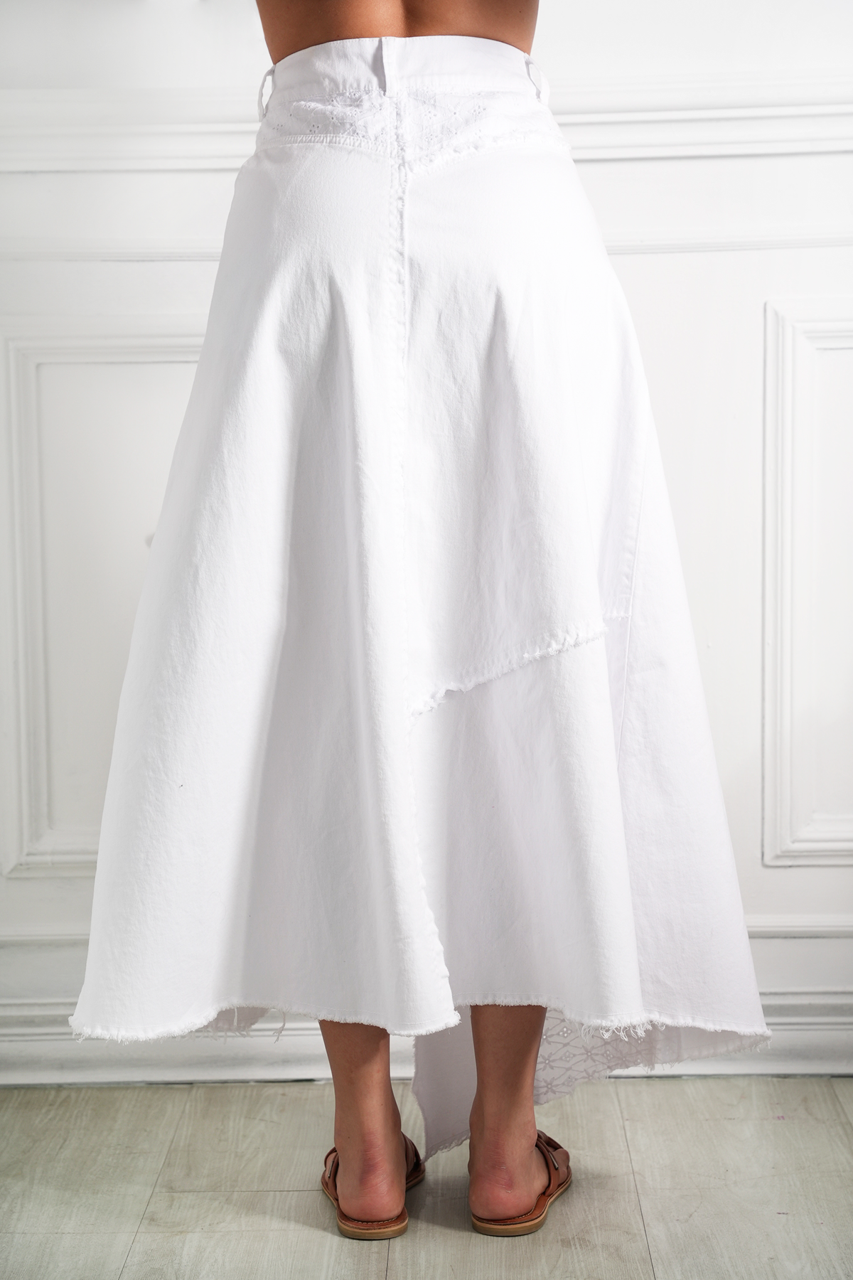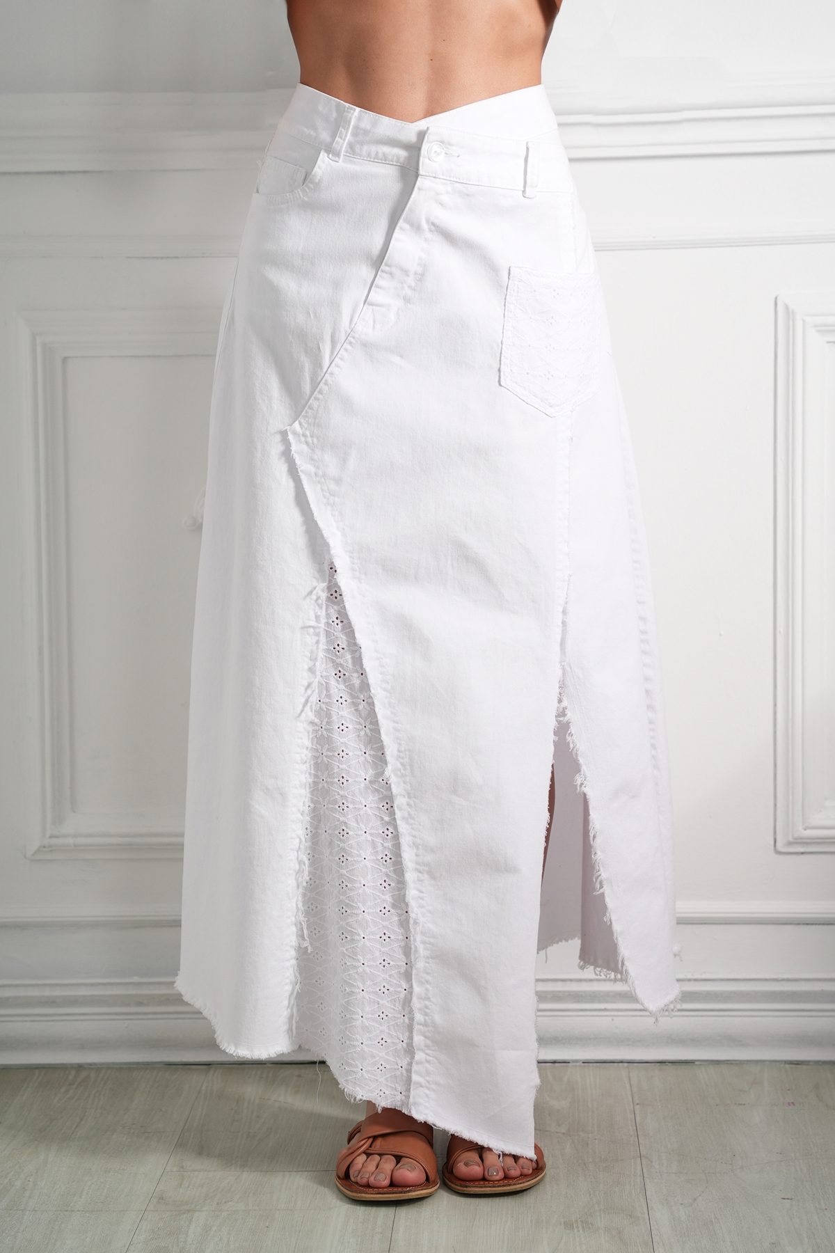 Descripción: Falda larga asimétrica tiro alto con aplique en encaje, con bolsillo en la parte de adelante, elaborada en drill