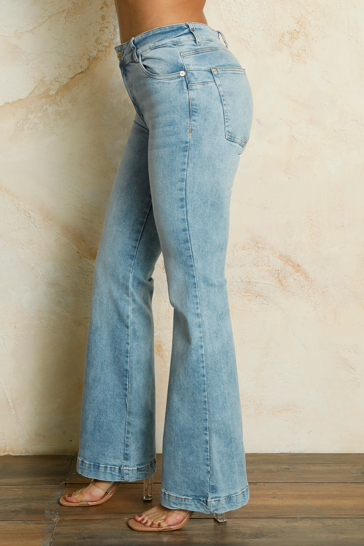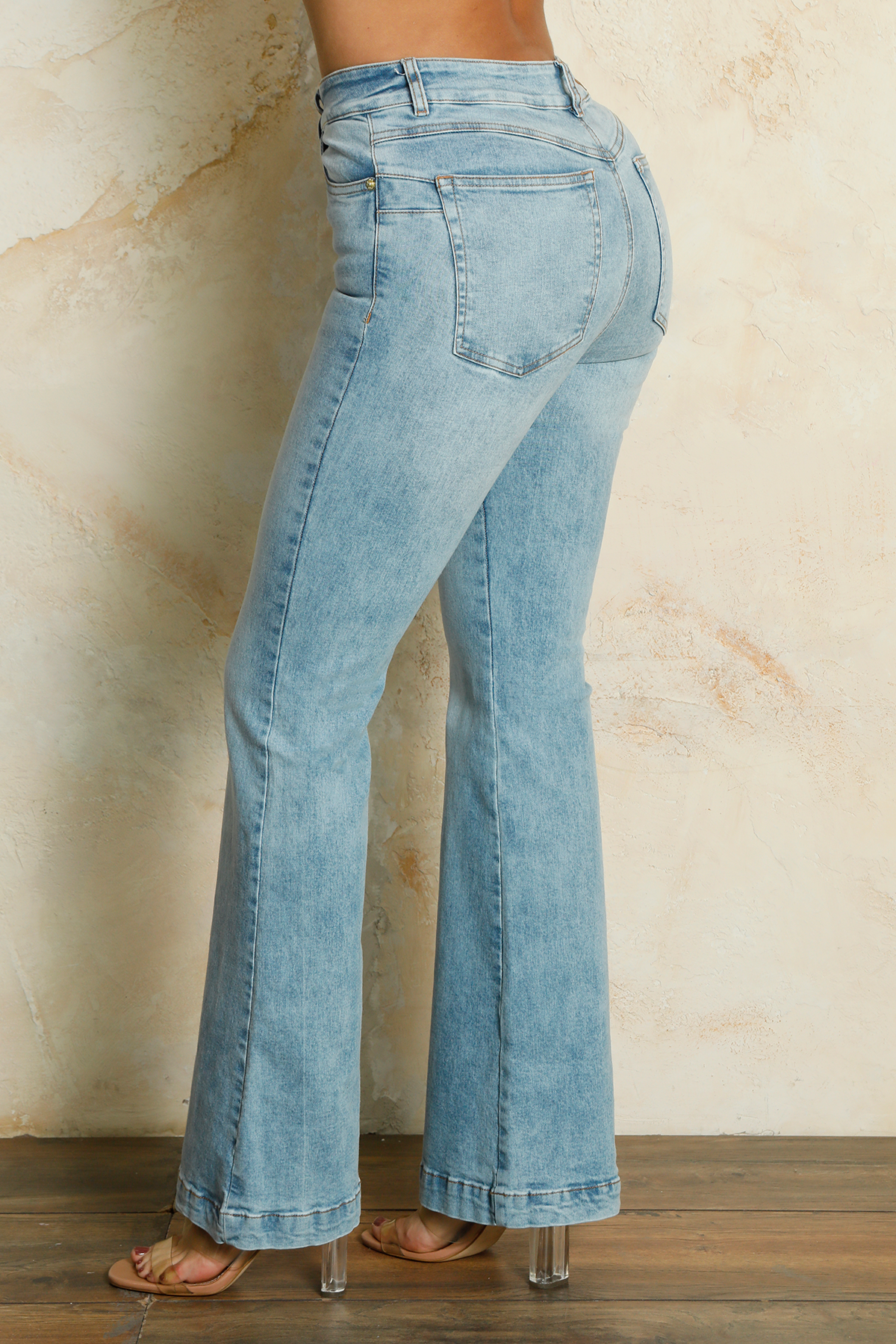 Descripción: Un clásico reinventado que estiliza y resalta la silueta. Su diseño de tiro alto define la cintura, mientras que la bota campana alarga visualmente las piernas y aporta un aire retro en tendencia. Confeccionado en denim de excelente calidad, ofrece comodidad, ajuste y versatilidad para crear looks que van desde lo casual con tenis, hasta lo elegante con tacones o sandalias.